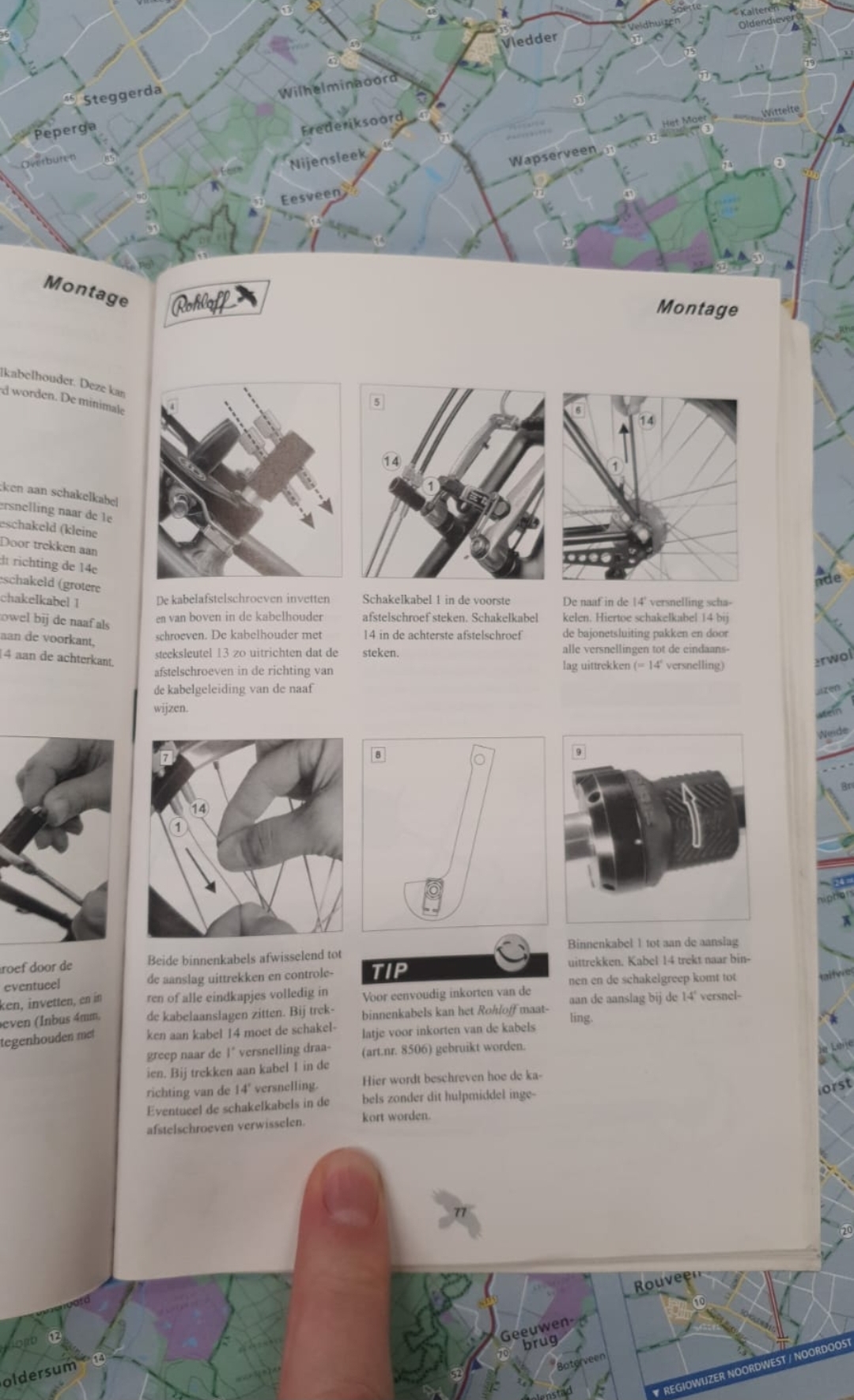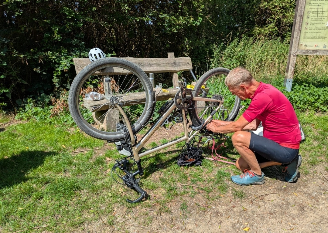 Wie ons al wat langer volgt kent het verhaal. De onverwoestbare Rohloff naaf gaf het op. Dit keer die van Harmien. De mijne enige jaren terug in Frankrijk. We hebben vier! uur onderweg bij een picknick bankje geprobeerd het probleem op te lossen. Eerst een nieuwe easyset geplaatst. Dat kan ik inmiddels. Maar toen. De schakelkabel kwam niet meer op spanning. Telefonisch overleg met de fietsenmaker. Nee alles is zoals het moet. Toen maar een stukje kabel afgeknipt. Helaas met het gevolg dat Harmien nu meerdere versnellingen mist. Dus stijl en lang klimmen lukt bv niet.