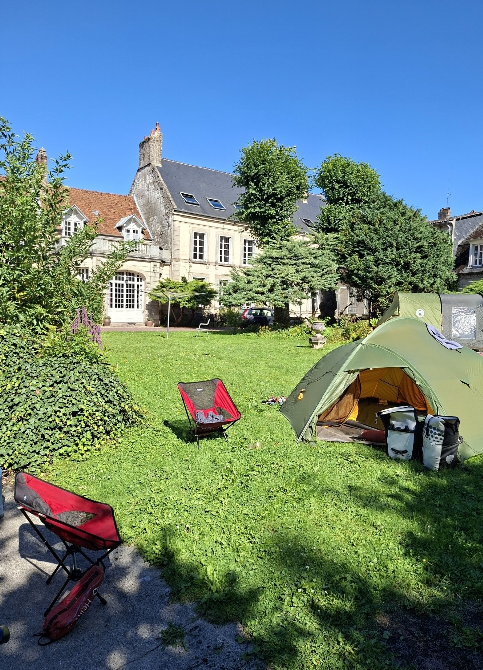 Vandaag een lekkere rustdag. Sinds Maastricht was het hier nog niet van gekomen. Bij een oud Frans jachthuis, beheerd door twee Nederlandse vriendinnen. Ooit in Ik Vertrek te zien geweest. De supermarche zit op loopafstand en de tuin heeft schaduw en een riviertje.