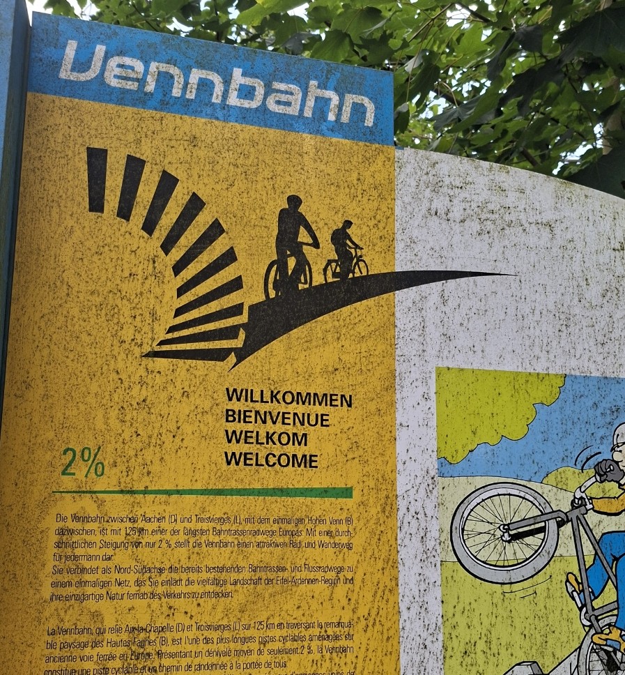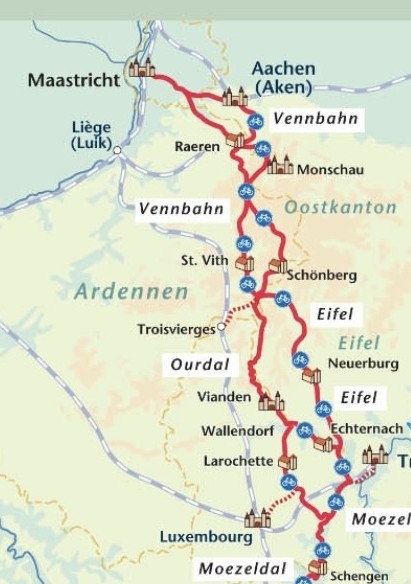 Daarna met Benjaminse via Aken naar het Zuiden. Via de Vennbahn en nog wat zelf opgezochte paden. Die eigen paden verliepen pittig, zeker door Luxemburg. Regelmatig stappen we af en lopen een te steile helling. Vermoeiend.